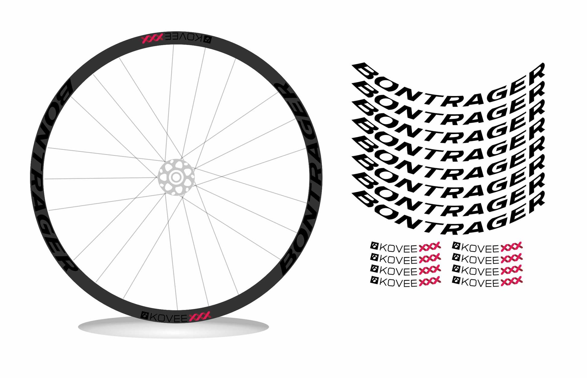 Verranno forniti al momento dell'acquisto un kit, 16 adesivi Bontrager kovee xxx colore personalizzato (KIT COMPLETO PER 2 RUOTE) come vedete in foto.