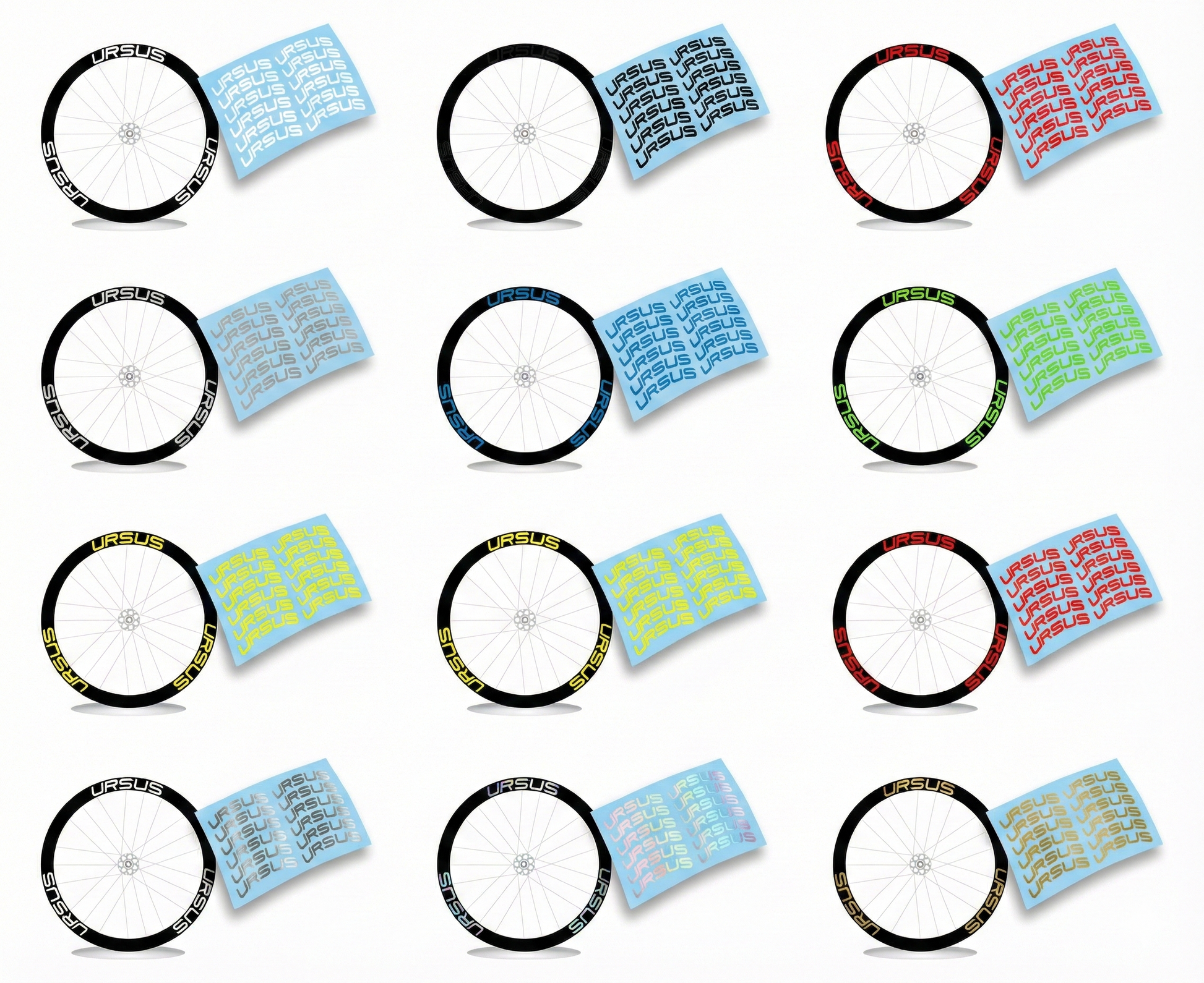 Verranno forniti al momento dell'acquisto un kit, 12 adesivi Ursus curvati colore personalizzato (KIT COMPLETO PER 2 RUOTE) come vedete in foto.